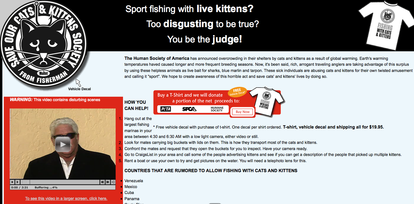 Si tratta di una bufala ben congegnata per far leva sull’indignazione, sfottere un certo animalismo superficiale e così scavalcare il raziocinio che permetterebbe di scoprire gli indizi della burla, che sembra finalizzata a vendere le t-shirt di protesta offerte dal sito Save Our Cats from Fishermen (salvate i nostri gatti dai pescatori).