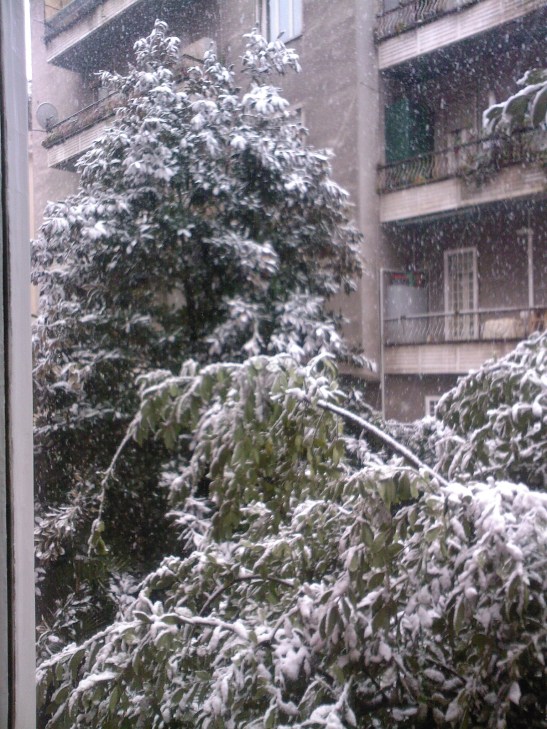 Siamo usciti dall’ufficio per scendere in strada a far palle di neve, lanciandocele addosso l’un l’atra come mocciosi; abbiamo raccolto la neve sugli alberi, scritto sui vetri imbiancati delle auto amo tizia piuttosto che W Lazio; abbiamo cominciato a fantasticare di trasformare il lungo viale in discesa che da Monte Mario conduce a San Pietro in una pista improvvisata per slittini, ricordandoci come da ragazzini li si confezionava con i sacchi della spazzatura; oppure il desiderio di costruire un pupazzo di neve…