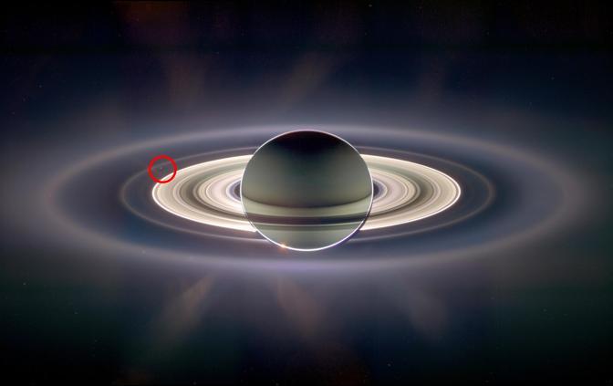 Siamo quel puntino laggiù. È la Terra, vista dalla sonda Cassini in orbita a 2,2 milioni di chilometri intorno a Saturno. L’immagine è la somma di 165 foto scattate nell’arco di quattro ore il 15 settembre 2006. La particolarità di questa foto è che è l’immagine della Terra ripresa a più grande distanza mai realizzata, oltre un miliardo di chilometri, e fa comprendere quanto piccoli siamo anche nel Sistema solare.