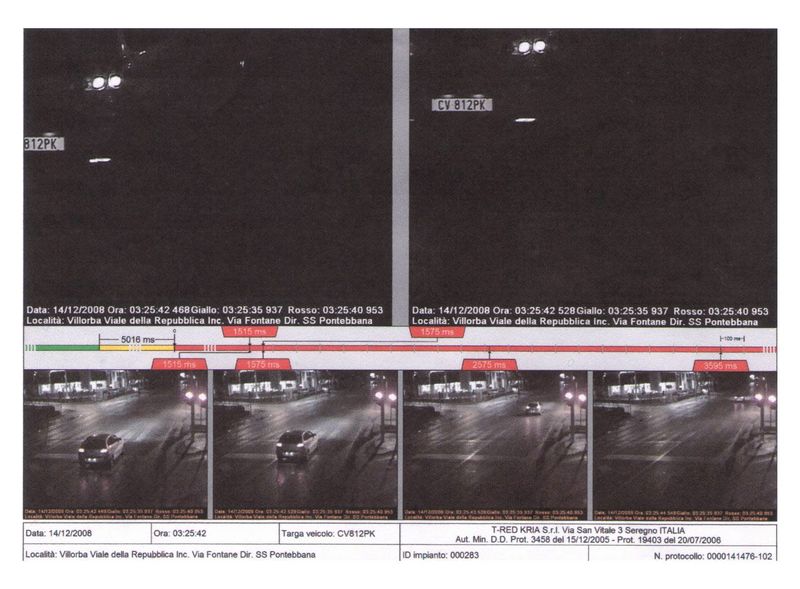 Onestamente, non c’è da metterci la mano sul fuoco, perché era buio e i colori si vedono poco. Andando a senso, la luce accesa dovrebbe essere quella di centro, quindi gialla, ma siccome non si vedono i contorni della lanterna non è sicuro. Ben più sicuro è stato un giudice di pace di Treviso, cui un vigile ha mostrato una foto ingrandita: ha respinto il ricorso del presunto trasgressore, prendendo per buono il “cronometro” che l’apparecchio di rilevazione – il “famigerato” T-Red – imprime sui fotogrammi (e che indica un rosso scattato da poco).