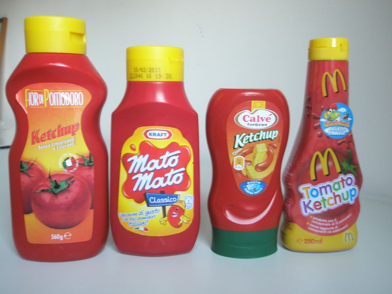 Sullo scaffale del supermercato ho trovato quattro bottiglie di ketchup di quattro aziende diverse .