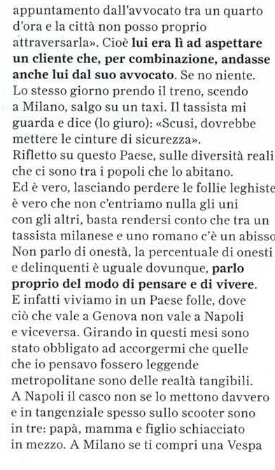 Bisogna passarci molto tempo. Così come io ho passato tanto tempo nella civilissima, pulitissima, capitale della legalità, dei tassisti onesti e della moda Milano, nella mia Torino, e nella bella Gallipoli.