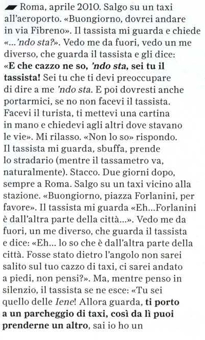 Francesco: Questo articolo di Bizzarri, oltre a essere divertentissimo, come quasi sempre lo è, è comico e amaro al tempo stesso e, pur nell’apparente qualunquismo, mi sembra contenere pungenti osservazioni e un fondo di drammatica verità… D’altra parte, dei taxi a Roma mi capita abbastanza spesso di usufruire e, lo dico senza alcun disprezzo o volontà di generalizzare né per gli uomini né per una categoria di lavoratori, i tassisti romani sono proprio come li dipinge il buon Luca… Se poi le differenze con quelli milanesi sono così evidenti e palesi…
