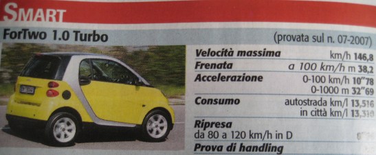 Mah, forse sono io ad avere il piede pesante, forse sono incontentabile, chissà…tutto plausibile se non fosse che lo stesso mensile, a seguito di prove sul campo, attribuisce alla Smart 84 Cv (coupè) un consumo compreso fra 13,3-13,5 km.lt. il che è persino troppo.