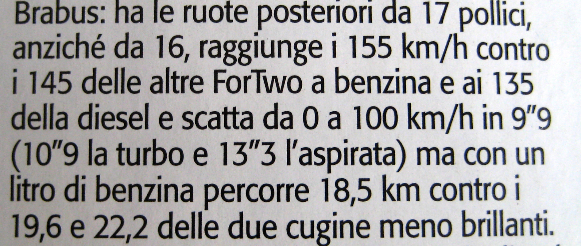 Nasce dalla lettura di un articolo pubblicato oggi sull’inserto Coupè, spider, cabriolet allegato al mensile Auto dove parlando della Smart Brabus cabrio, le attribuiscono un consumo medio pari a 18,5 km./lt ovvero di poco superiore al consumo della Smart 84 Cv che consuma 19,6 km/lt. 😀 Rido a crepapelle, perchè deve trattarsi di una barzelletta.
