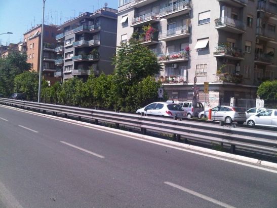 Se la foto qui sopra non vi dice nulla, non vi preoccupate: ciò che si dovrebbe vedere (il segnale di preavviso di un autovelox sulla Tangenziale Est di Roma, vicino alla stazione Tiburtina) in effetti non si vede. Colpa degli alberi e di una grafica non proprio in linea col Codice. Finora, poco male: in quel tratto di autovelox se ne sono sempre visti pochi, perché non c’è spazio per far appostare una pattuglia.