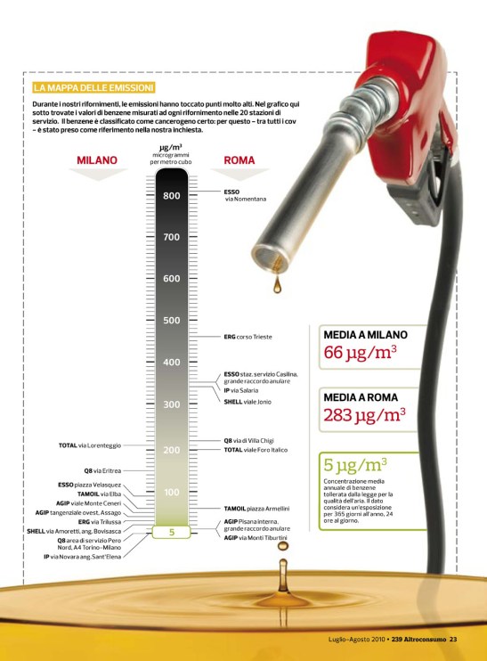 Giusto per non negarsi niente, a Roma un distributore offre una concentrazione di benzene pari ad 800 microgrammi (il peggior distributore milanese si ferma, per così dire, a soli 215.)