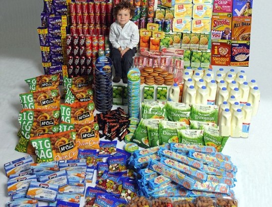 Cumuli di patatine, snack, merendine e gelati: la foto allegata mostra la quantità di cibo-spazzatura che un bambino inglese mangia in un anno. L’ha pubblicata il Mail Online un articolo di Claire Cohen.