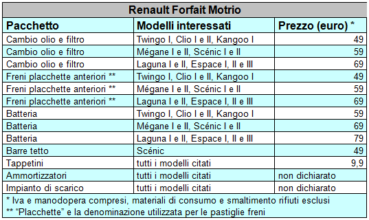 I modelli interessati sono Twingo 1a serie, Clio 1a e 2a serie, Kangoo 1a serie, Mégane 1a e 2a serie, Scénic 1a e 2a serie, Laguna 1a e 2a serie ed Espace 1a, 2a e 3a serie. I prezzi di ciascun pacchetto (vedere la tabella) variano da 49 a 79 euro, Iva e manodopera compresi.