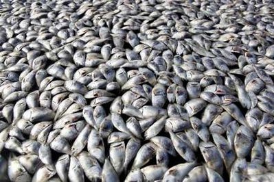 A quanto pare è uno dei danni collaterali della fuoriuscita di greggio dalla piattaforma della BP che, grazie anche alla bassa marea, ha lasciato senza ossigeno i pesci in 60 cm. d’acqua.
