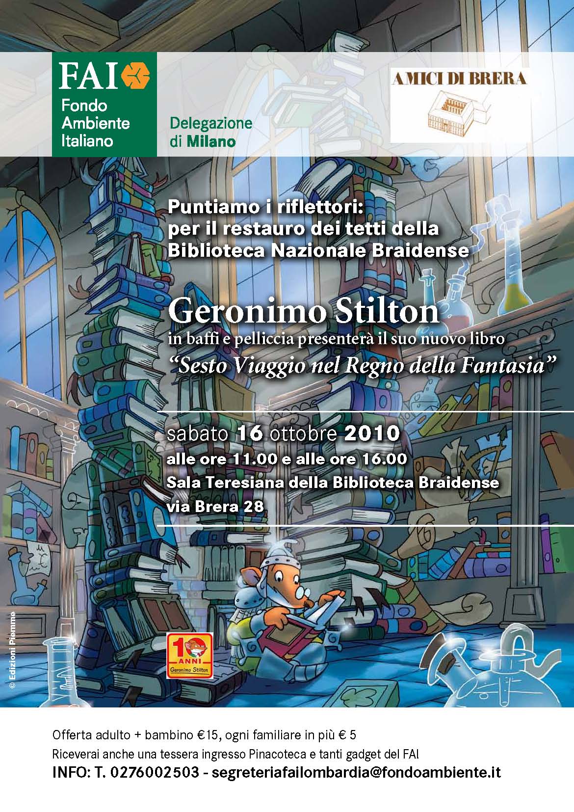 Cari Amici, Vi unisco la locandina-invito per sabato 16 ottobre alla lettura di fiabe fatta da un attore travestito da topo giornalista Geronimo Stilton (in baffi e pelliccia) nella meravigliosa Sala Teresiana della biblioteca nazionale Braidense per chi di voi avesse bambini, nipotini, parenti e amici con bambini da 2 a 11 anni.