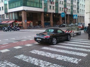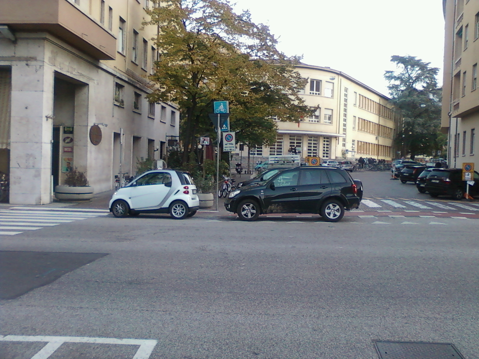 Si riferiscono a clienti di un bar che parcheggiano addirittura ostruendo un incrocio, in un modo che onestamente siamo abituati a vedere in zone d’Italia più degradate: se non fosse per il rango delle vetture, per la pista ciclabile e i portici, si potrebbe ritenere che siano state scattate un migliaio di chilometri più a Sud (anche se qui a Bolzano comportamenti del genere danno più nell’occhio, perché nelle foto non si vedono altre irregolarità clamorose).