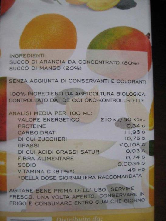 Etichetta originale (in grammi): Calorie 50/100 ml. – Proteine 0,34 – Carboidrati 11,96 – Grassi <0,108 – Acidi grassi saturi 0,03 – Fibra alimentare 0,74 – Sodio 0,0034 – Vitamina C 49 grammi pari a 81% dose giornaliera