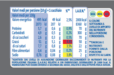 Altra fondamentale differenza rispetto alle GDA è che si prendono in considerazione tutti i nutrienti, non soltanto quelli “critici” come grassi e zuccheri per cui il bollino colorato compare anche sulle voci di: proteine, carboidrati e fibre.