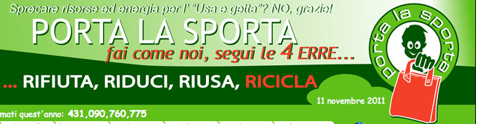 La campagna Porta la Sporta promossa dall’Associazione Comuni Virtuosi insieme a Italia Nostra e Adiconsum, ha in programma numerose iniziative per ridurre il peso degli imballaggi e di altri articoli usa e getta. La volontà è di coinvolgere non solo i consumatori, ma anche la grande distribuzione organizzata che dovrà svolgere un ruolo importante verso le aziende produttrici.