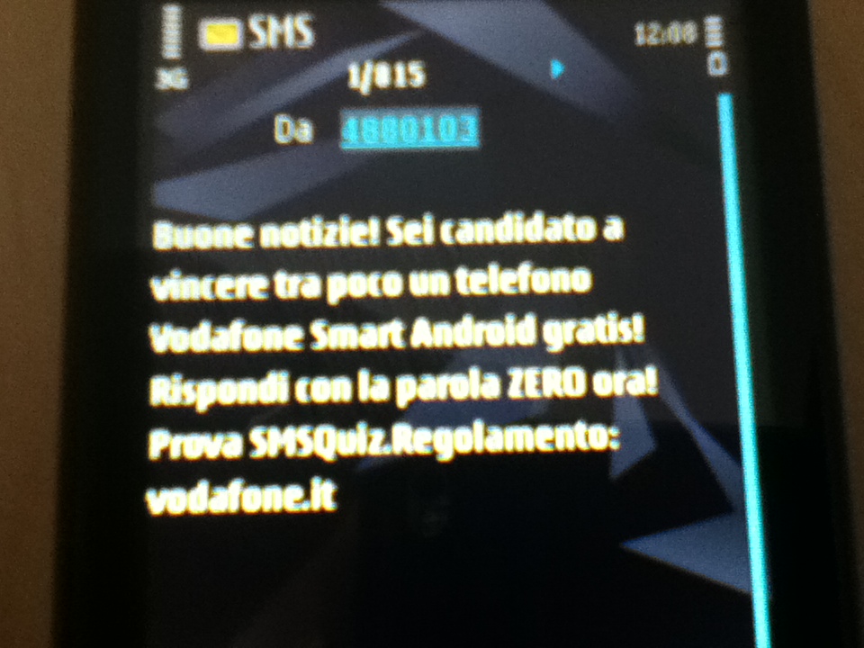 La qualità della foto non è molto alta, tuttavia si capisce che se rispondi Zero a questo sms potresti vincere uno Smartphone, che il servizio si chiama Smsquiz e che il regolamento si trova su Vodafone.it