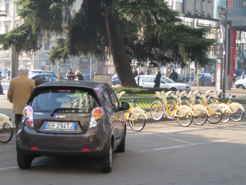 Interessante notare che uno di quei posti era abusivamente occupato da una vettura normale. Di conseguenza, una Fiat 500 di GuidaMi era stata costretta a parcheggiare di fianco all’area, occupando un paio di metri dell’area adiacente, a sua volta destinata alle biciclette di BikeMi (condivisione di biciclette, per capirci) ed anche in questo caso l’area delle biciclette era occupata da due automobili parcheggiate che di fatto ne limitavano in parte l’utilizzo.