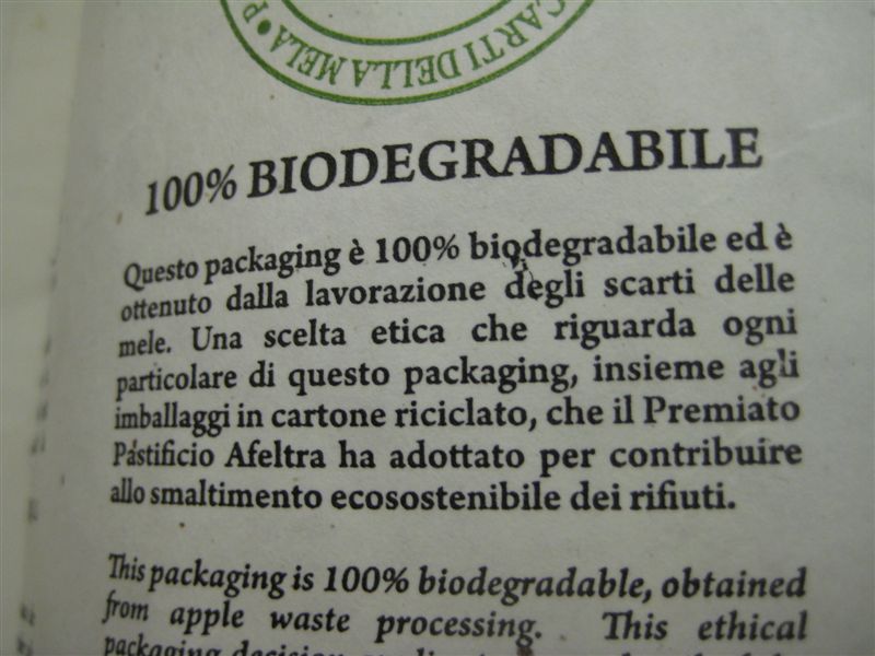 Per una volta tralascio la qualità del prodotto per esprimere il mio apprezzamento per la scelta di ricavare i sacchetti della pasta dagli scarti delle mele, recuperando uno scarto e dando vita ad un imballo biodegradabile al 100%.