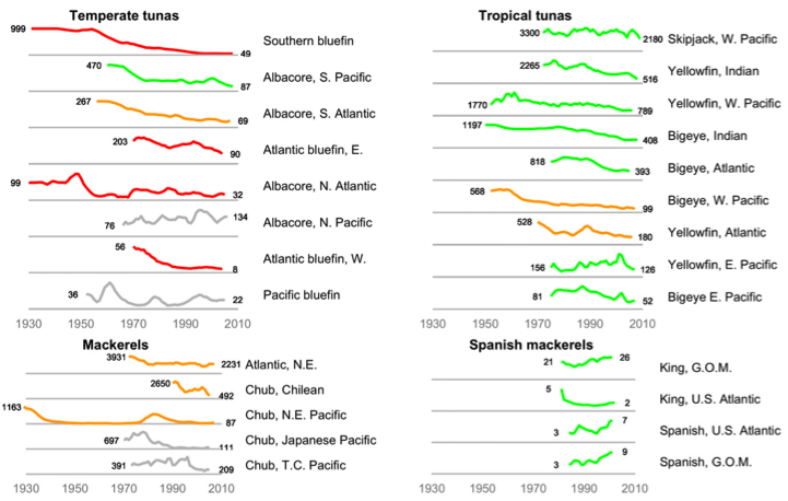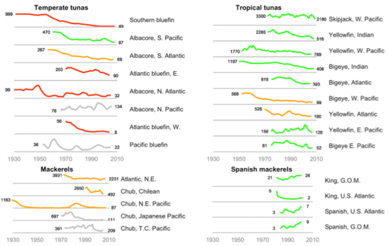 La famiglia che ne esce peggio è senz’altro quella dei tonni delle acque più fredde, animali che hanno un ciclo vitale lungo ma anche, per loro sfortuna, un elevato valore commerciale. In alcuni casi (per esempio i tonni atlantici) i branchi sono stati depauperati dell’80% e gli attuali ritmi di pesca contribuiscono a peggiorare una situazione che da tempo non è più sostenibile, perché il numero di esemplari pescati è ben al di sopra della capacità di ripopolamento. In totale, ogni anno il 12,5% dei tonni viene ucciso.