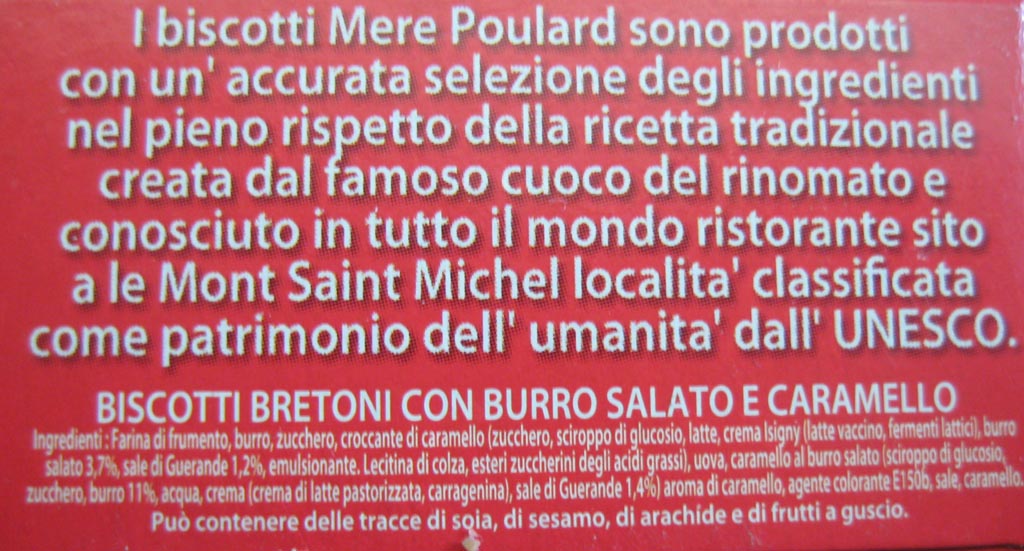 Nei giorni scorsi ho acquistato una confezione di biscotti francesi e questa è l’etichetta degli ingredienti (decisamente ingrandita); basti pensare che la lettera “I” della prima riga (I biscotti Mere Poulard…) è alta 3 millimetri se non meno, vi lascio immaginare per l’appunto la leggibilità degli ingredienti.