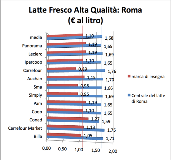 Abbiamo confrontato il prezzo della bottigliadella Centrale del Latte di Roma di Alta Qualità venduto al prezzo medio di 1,68 euro, con le confezioni che hanno il marchio del supermercato. Il dato più evidente è che la bottiglia della Centrale costa il 50% in più.