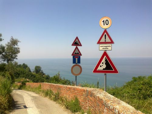 Abituati come siamo a malasegnaletica e divieti “contrattabili”, può sfuggire la stranezza di questa foto: un divieto di circolazione accompagnato da una serie di segnali di pericolo che ovviamente non avrebbero ragione di esistere se davvero nessuno circolasse. Siamo a Casteldimezzo, uno dei primi angoli di Adriatico movimentati dalla collina, immediatamente a sud della piatta riviera romagnola.