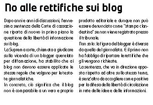 Resta valido anche quanto scritto sul suo Blog da Paolo Attivissimo che invece è un giornalista e che critica la supponenza della stama ufficiale: questi sono coloro che hanno la pretesa di essere depositari dell’informazione. Guardano i blogger dall’alto in basso, ma poi attingono a piene mani (e a scrocco) al loro lavoro, senza neanche verificarlo. Dicono che i blogger sono inaffidabili, però li copiano acriticamente. Complimenti.