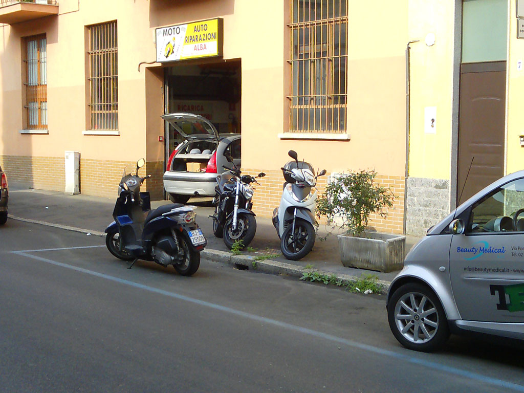 ed infine c’è l’altro meccanico che piazza uno scooter esattamente in mezzo all’area di parcheggio, occupando di fatto lo spazio di una vettura se non di più… (senza contare che non si fa scrupoli a parcheggiare anche numerosi mezzi sul marciapiede).