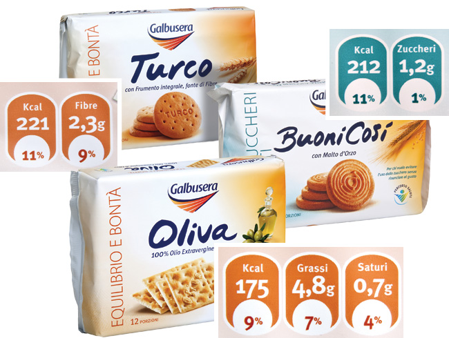 Galbusera presenta sul retro informazioni non standardizzate, in cui le omissioni sembrano fatte ad hoc. I biscotti senza zucchero Buoni Così riportano lo zucchero (che non poteva che essere basso); i Turco, essendo di farina integrale, indicano le fibre. Stesso discorso per i crackers Oliva: niente sul sale, che per ogni pacchetto copre ben il 17,5% della dose giornaliera.