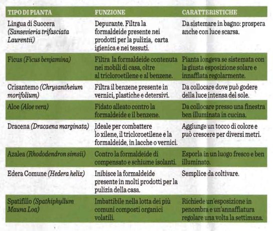 Interessante scoprire che la Dracena può essere utilizzata in ufficio in quanto è in grado di assorbire il tricloroetilene dei toner. Pubblico la tabella riassuntiva con indicate le piante, che cosa filtrano/depurano ed alcuni consigli d’uso.