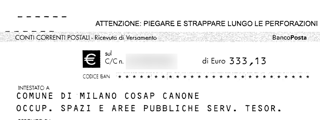 Apro la busta ed ecco la sorpresa quotidiana (Grazie Pisapia) ovvero il bollettino per il pagamento della Cosap ovvero del Canone di Occupazione di Spazi ed Aree Pubbliche; detto in parole povere, la tassa sui passi carrabili, (in questo caso…) dovuta da privati ed aziende…