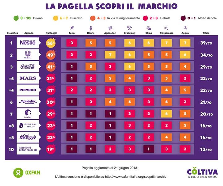 Sulla base di questi temi, la pagella-Scopri il Marchio ha evidenziato come alcune aziende (ABF, Kellogg’s, Mars) siano nettamente più indietro di altre, come Unilever o Nestlé. Tuttavia, nessuna di queste aziende è oggi leader nella lotta alla fame e alla povertà.