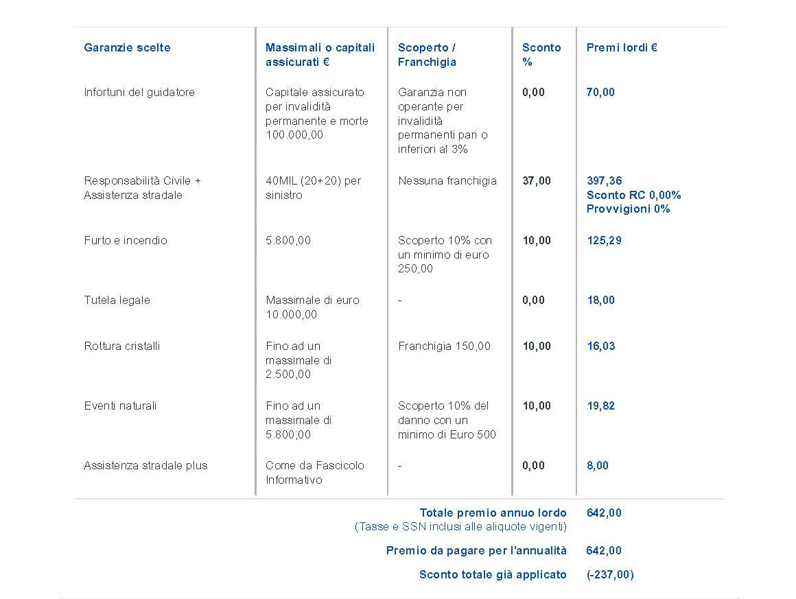 La scorsa settimana mi ha scritto Genialloyd chiedendomi di rimetterli alla prova, ecc, ecc. ed allegando una proposta di polizza che successivamente ho calibrato al meglio portando il massimale da 6+6 milioni a 20+20 avvicinandolo quindi a quello di Zurich (massimale unico da 50 milioni), ed ottenendo un premio di € 642.