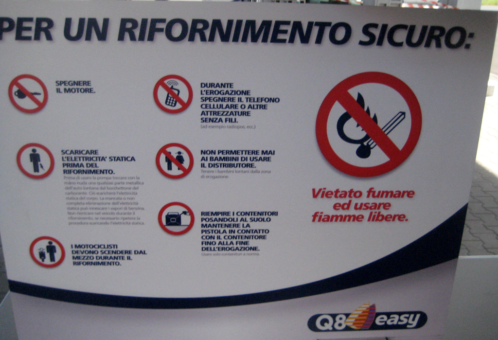 Da segnalare infine anche il cartello con i consigli per un rifornimento fatto in sicurezza, ben leggibile, chiaro, e sicuramente inutile, dato che dubito fortemente che gli automobilisti spengano il cellulare durante il rifornimento. 😉