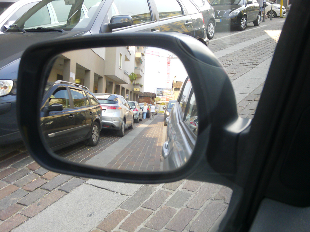 Tutte le auto che vedete nella foto del mio specchietto sinistro, sono in sosta sulla carreggiata. Bloccano quelle regolarmente parcheggiate ed impediscono il transito degli altri; fortuna vuole che sia una via di scarso passaggio.