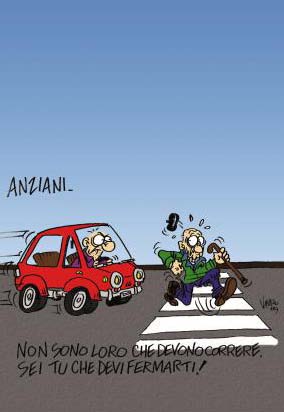 Non sono in grado di “scattare” per evitare i pericoli o di attraversare la strada velocemente. Sono naturalmente anziani. Non si può chiedere loro di adattarsi al traffico, ma si deve chiedere a chi guida di rispettarli. Però che anche i pedoni facciano la loro parte (giovani e anziani che siano) e mi riferisco, quale esempio, a quel tipo che impegnato com’era a scrivere sullo smartphone ha attraversato di slancio la strada, senza neanche prendere in considerazione il traffico ovvero me che stavo arrivando. Per sua fortuna lo avevo già notato e conoscendo i miei polli… Clicca QUI per scaricare il libretto (f.to 10×15 cm, 32 pagine a colori) che ha come filo conduttore l’ironia delle più importanti matite italiane che con le loro vignette, oltre a strappare sorrisi amari, invitano chi guida alla riflessione e all’adozione di comportamenti più responsabili sulle strade. Insieme alle vignette, foto di personaggi con messaggi, testi letterari e scientifici.