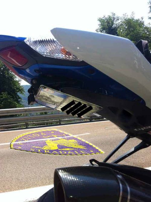 Apparentemente, i tre “piloti” avevano pianificato con cura l’impresa: evidentemente avevano tenuto conto che sul tratto appenninico della A7 c’è il Tutor e così hanno nascosto le targhe ripiegandole sotto le selle, come vedete in questa foto.