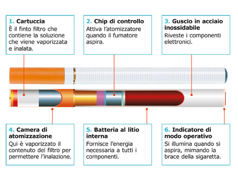 Si tratta di un dispositivo elettronico che non contiene tabacco. Quando il fumatore aspira, il passaggio dell’aria attiva un sensore collegato a una resistenza a batteria. La resistenza si scalda e produce una miscela di vapore acqueo e particelle di glicerina, glicole propilenico e, se si vuole, anche nicotina e aromi.