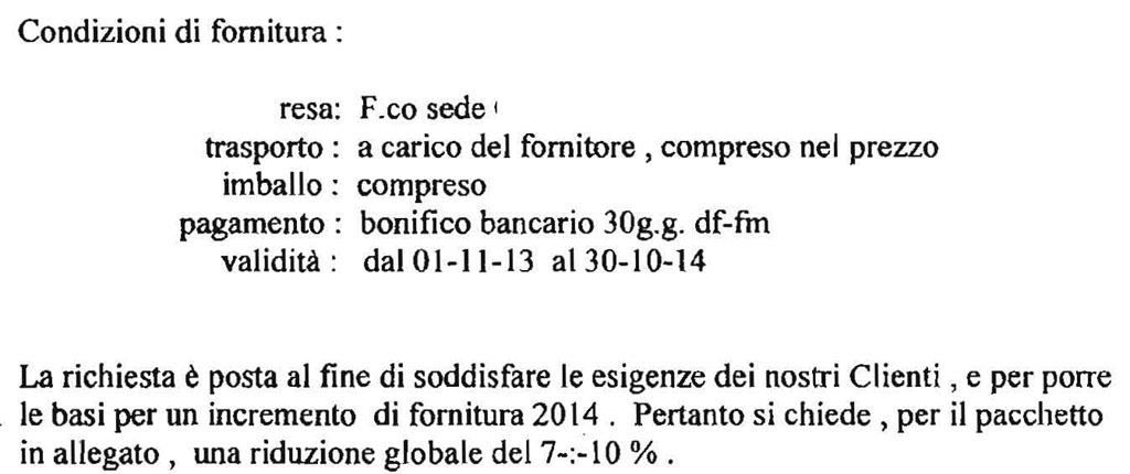 Quindi pretende il listino prezzi bloccato sino ad ottobre 2014, con una riduzione del 7-10% rispetto ai prezzi attuali, la consegna a mio carico ed un pagamento a 30 giorni rimessa diretta anzichè a 60 giorni Riba; quest’ultimo punto ai non addetti ai lavori può sembrare un vantaggio se non fosse che un pagamento a 60 giorni mediante Riba, è un pagamento a 60 giorni (a meno di un insoluto).