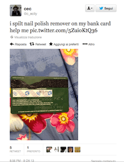 Sì, avete capito bene. È una richiesta di aiuto perché la persona ha rovesciato del solvente per unghie sulla propria carta di credito. Che già in sé non è una grande furbata, ma pazienza.