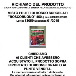 L’allerta (vedi foto a sinistra) riguarda la confezione da 450g “Misto frutti di bosco surgelati BoscoBuono” (lotto 13059, tmc gennaio 2015 codice ean 8000003001006).