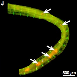 (Le frecce indicano particelle di plastica nel suo tubo digerente, inghiottite dallo stesso durante esperimenti in laboratorio)