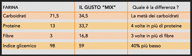 Il segreto della farina “magica“ è da ricercare nel diverso apporto nutrizionale rispetto a quella classica. La tabella proposta nel sito internet fa una comparazione tra i nutrienti che però risulta alquanto strana. I dati inseriti nella colonna di destra non sembrano molto corretti sia per quanto riguarda le proteine sia per le fibre.