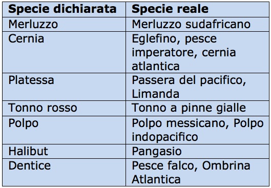 Le analisi hanno anche evidenziato la vendita di merluzzo africano come merluzzo atlantico e di pesce falco o ombrina atlantica come dentice. Un altro problema riguarda il cambio di specie necessario per mascherare la vendita di pesci considerati protetti come i delfini o alcuni squali.
