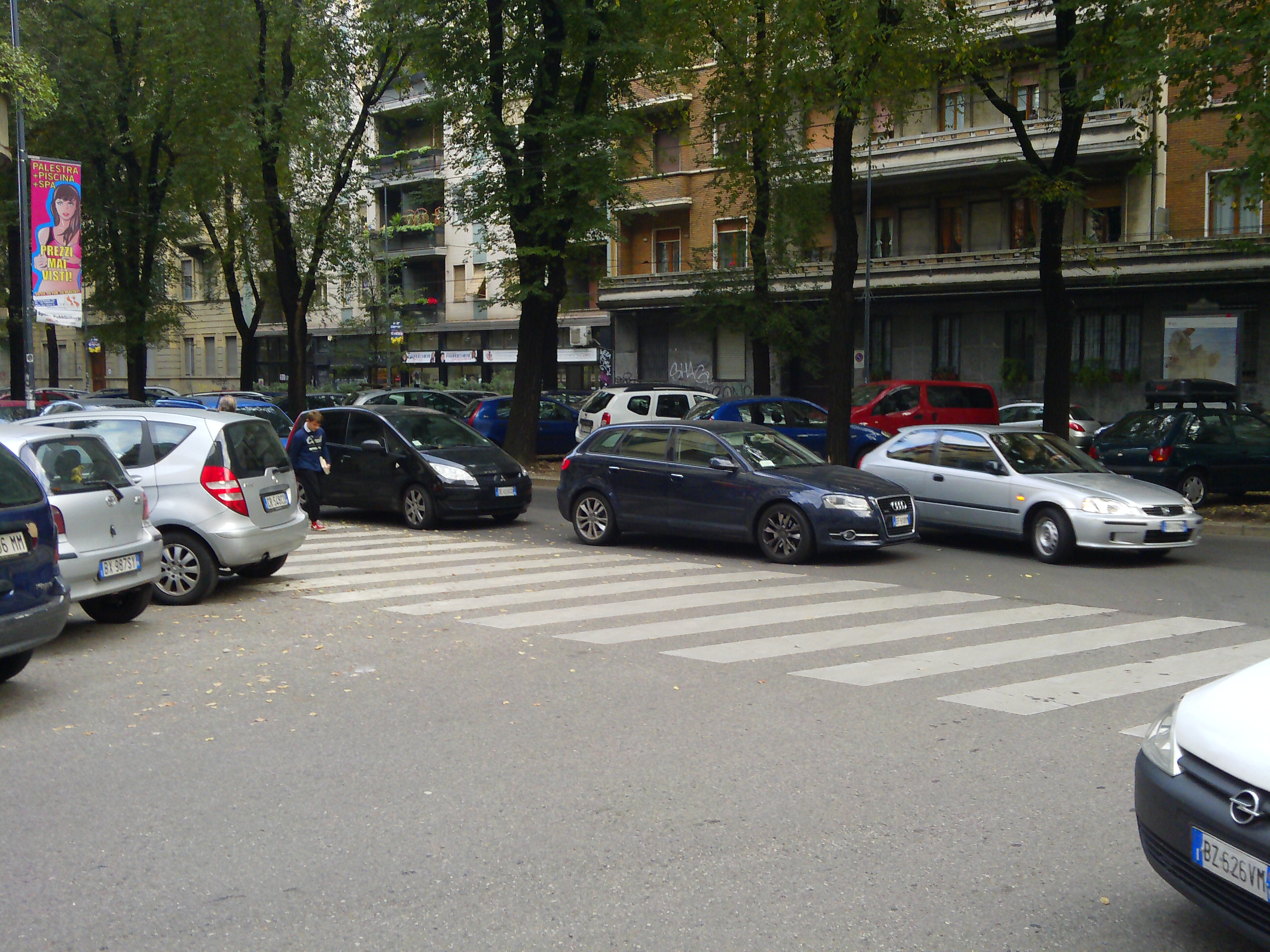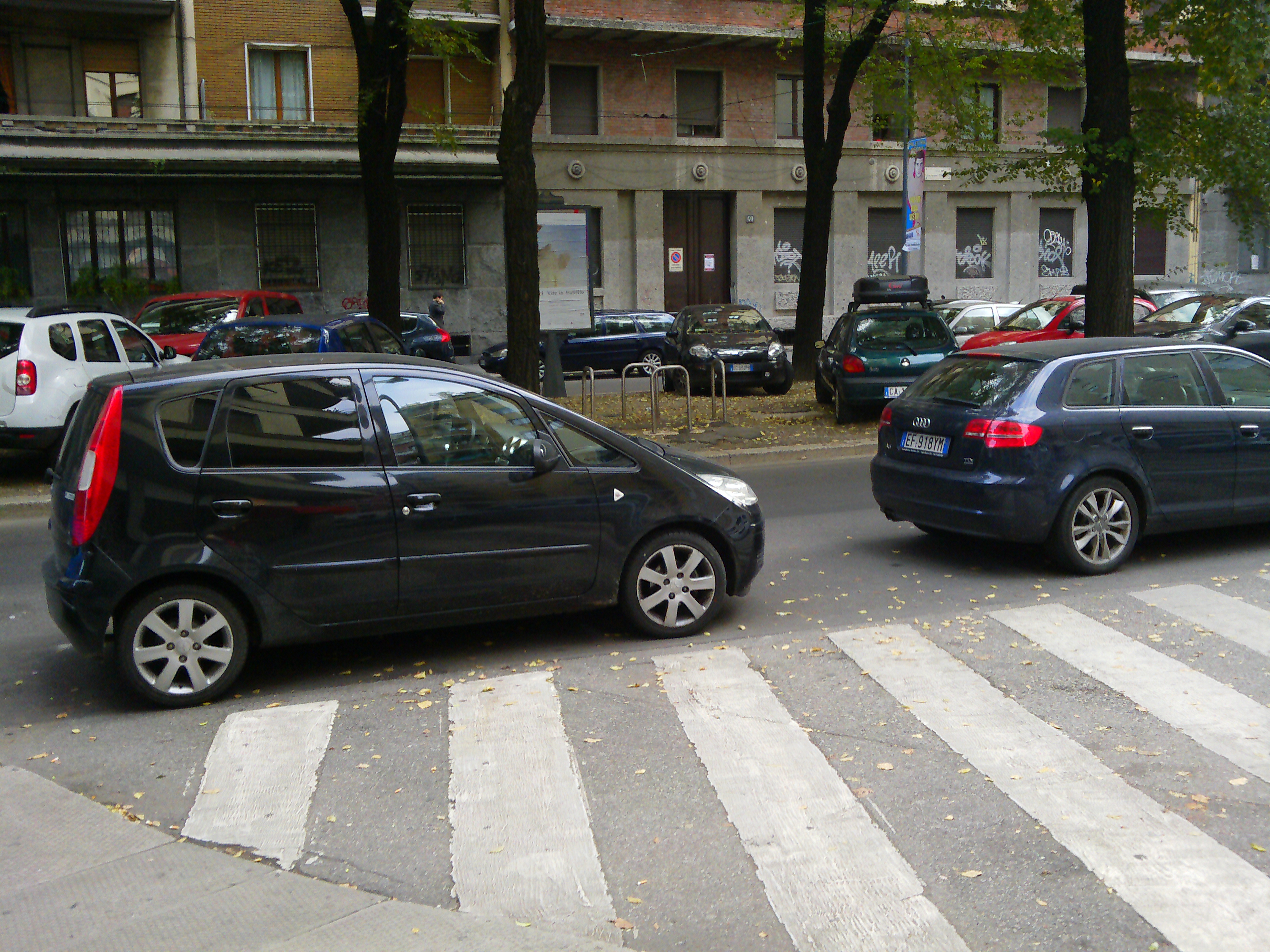 Milano, Via Pacini. Le due auto scure, sono in sosta, sulla carreggiata, ostacolando la svolta delle auto che sopraggiungono; succede spesso, per cui diventa normalità…