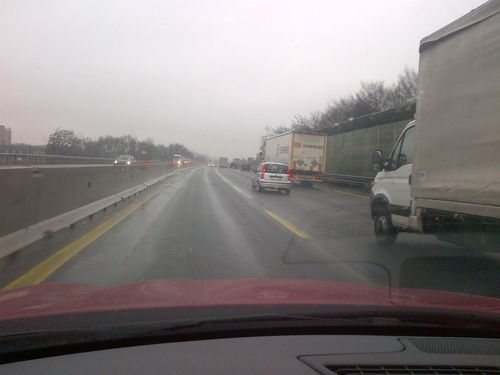 Osservate, in particolare, la striscia che corre vicina e parallela al guard-rail centrale: è acqua che ristagna e che in alcuni punti forma pozzanghere, quindi con rischio di aquaplaning.