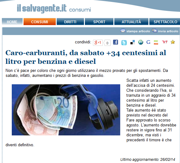 Ho verificato poi che tutti i siti di informazione hanno pubblicato la notizia, affermando che l’aumento era di 0,24 cent il che non è sbagliato, ma ho il sospetto che molti non abbiano veramente capito che un aumento di 0,0024 €/lt. non è una notizia. Ieri ho fatto il pieno e questo aumento ha inciso di 10 cent su una spesa di circa 63 €.