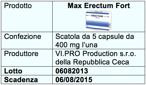Il Ministero invita chiunque avesse acquistato l’integratore Max Erectum Forte del lotto 06/08/2013 e con scadenza 06/08/2015 indicati sulla confezione a non consumarlo e a consegnarlo al rivenditore o al Servizio igiene degli alimenti e nutrizione della ASL locale.