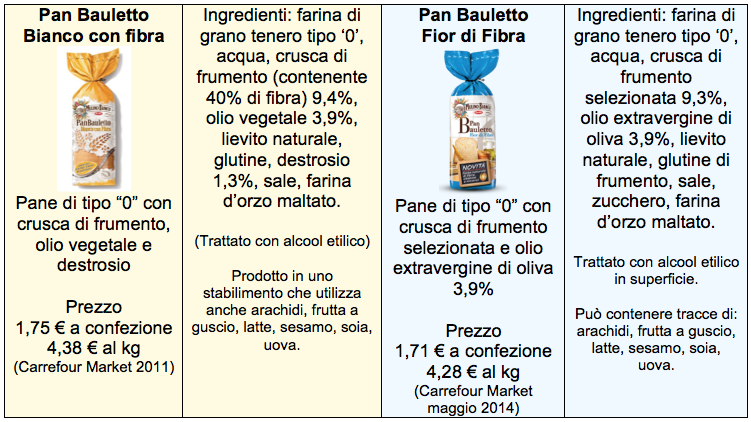 Rispetto alla formula precedente è cambiato il nome e anche la denominazione. Prima sull’etichetta compariva la scritta “pane tipo “0″ con crusca di frumento, olio vegetale e destrosio” adesso si legge “pane di tipo “0″ con crusca di frumento selezionata e olio extravergine di oliva 3,9%”.