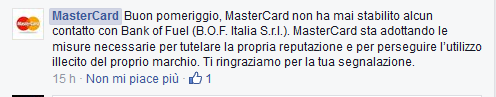 Bank of Fuel aveva scritto pochi giorni fa: Un nostro responsabile amministrativo ha da poco terminato un colloquio con Mastercard volto alla raccolta di informazioni relative alla campagna diffamatoria in atto nei nostri confronti. Invitiamo chiunque ne dubitasse a contattare in prima persona Mastercard al fine di sincerarsi di quanto sopra descritto.